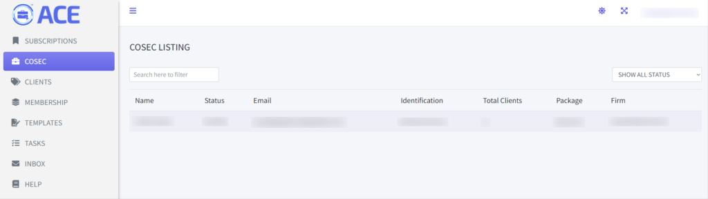 This page lists Cosecs that is registered under the currently logged-in Firm user. Clicking on any row will display more details about the Cosec.
