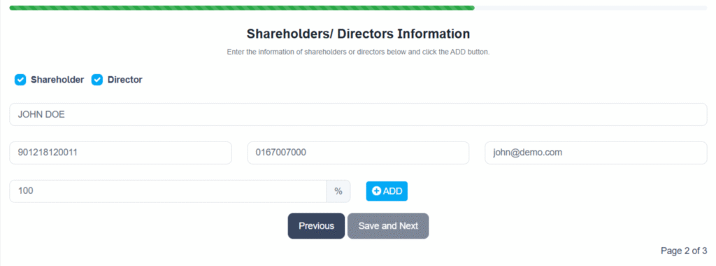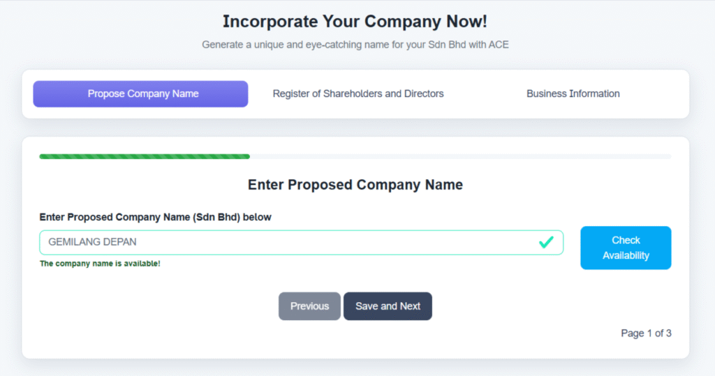 For our user, please share the link provided by ACE to the prospective owner or link from your website. When the link is opened, the incorporation form is displayed. Below is the guide on how to complete it.