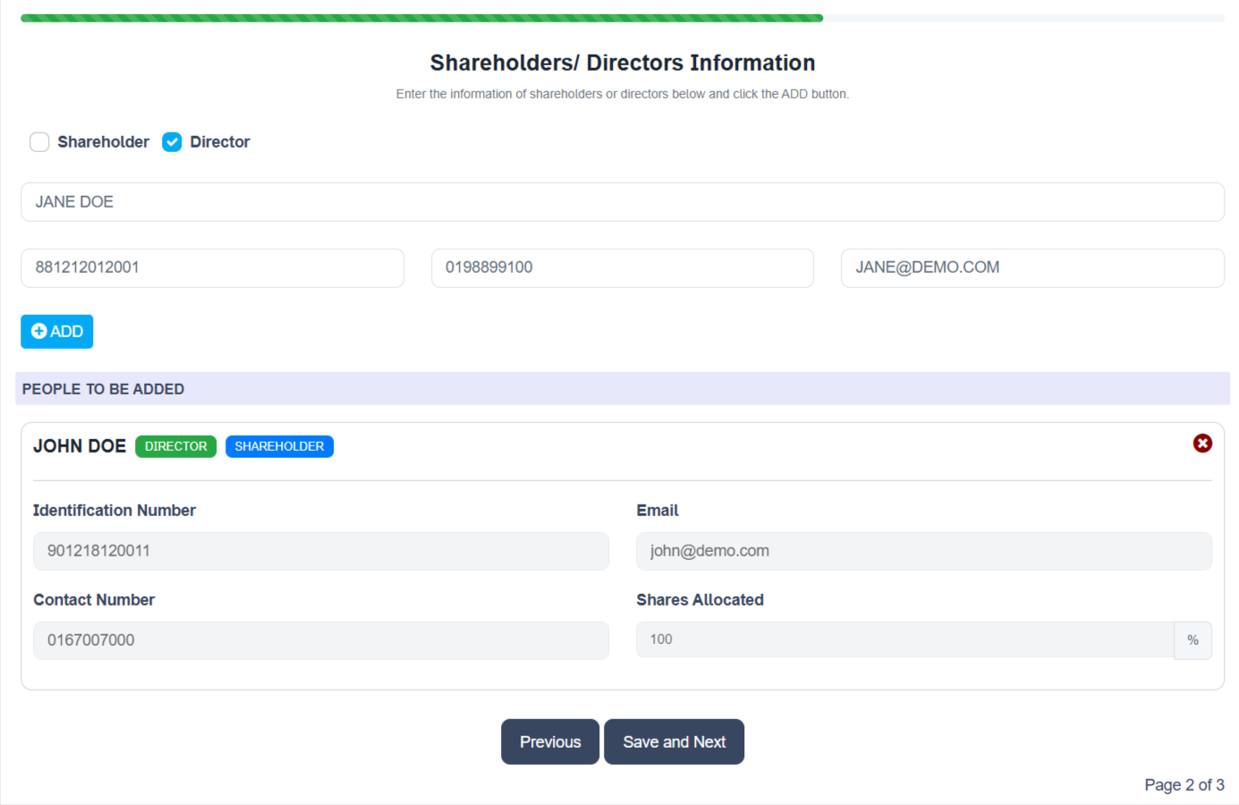 On this page, you can enter the information of a Shareholder and/or a Director. Click on the appropriate button on top. If this person is both a Shareholder and a Director, click on both checkboxes.