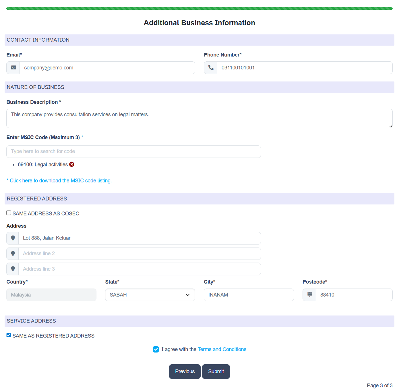 - MSIC Code = Enter the primary MSIC code for this business. You can either type the code if you know it (based on the SSM standard MSIC code) or you can also type a word and then pick from one of the suggested codes. You can enter up to 3 codes.